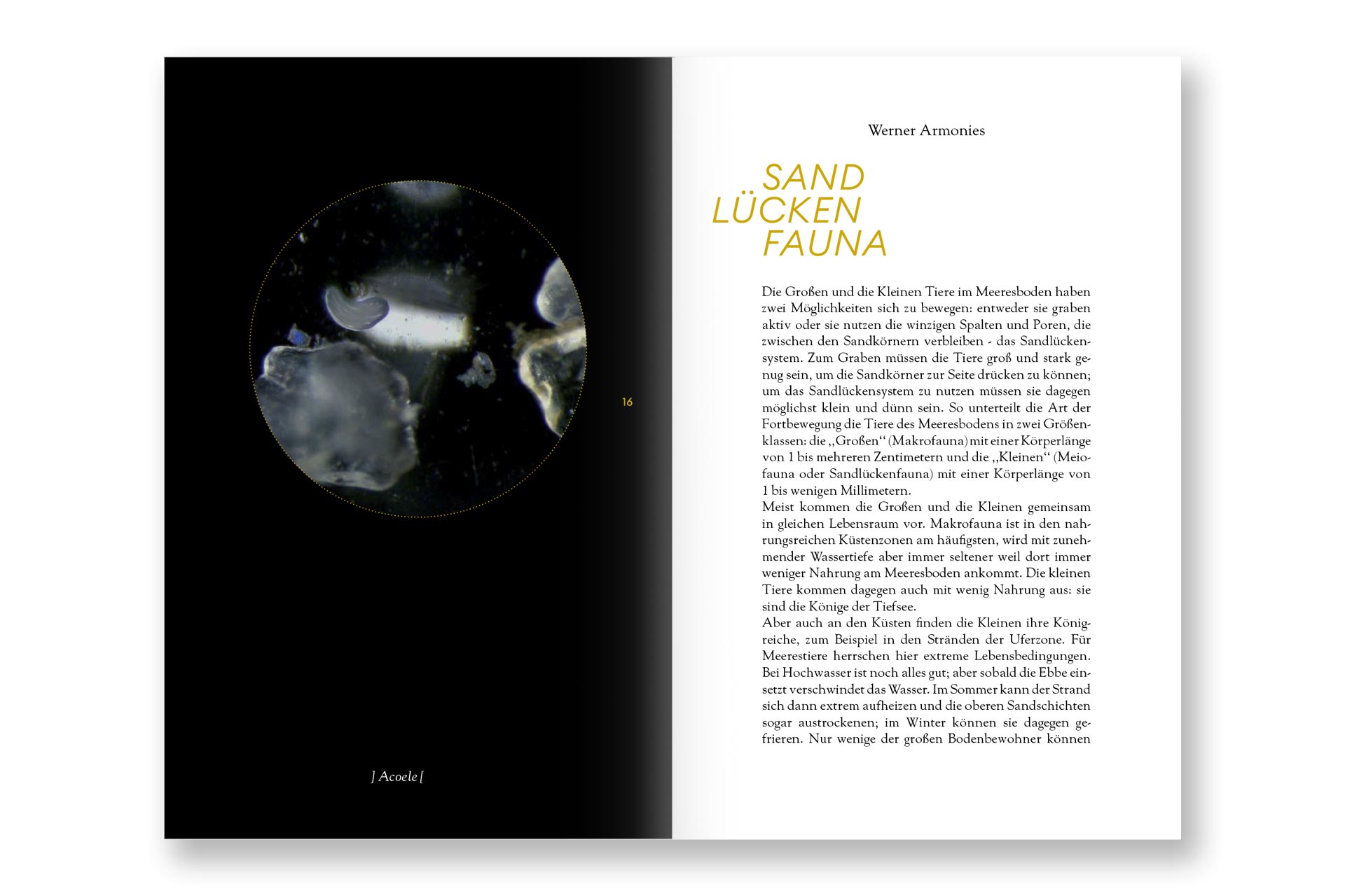 „Sandlückenfauna“ ist der Titel eines Videos der Künstlerin Doro Carl. Die begleitende Broschur zeigt mikroskopische Fotografien des noch weitgehend unbekannten Lebensraums in den Lücken zwischen den Sandkörnern.